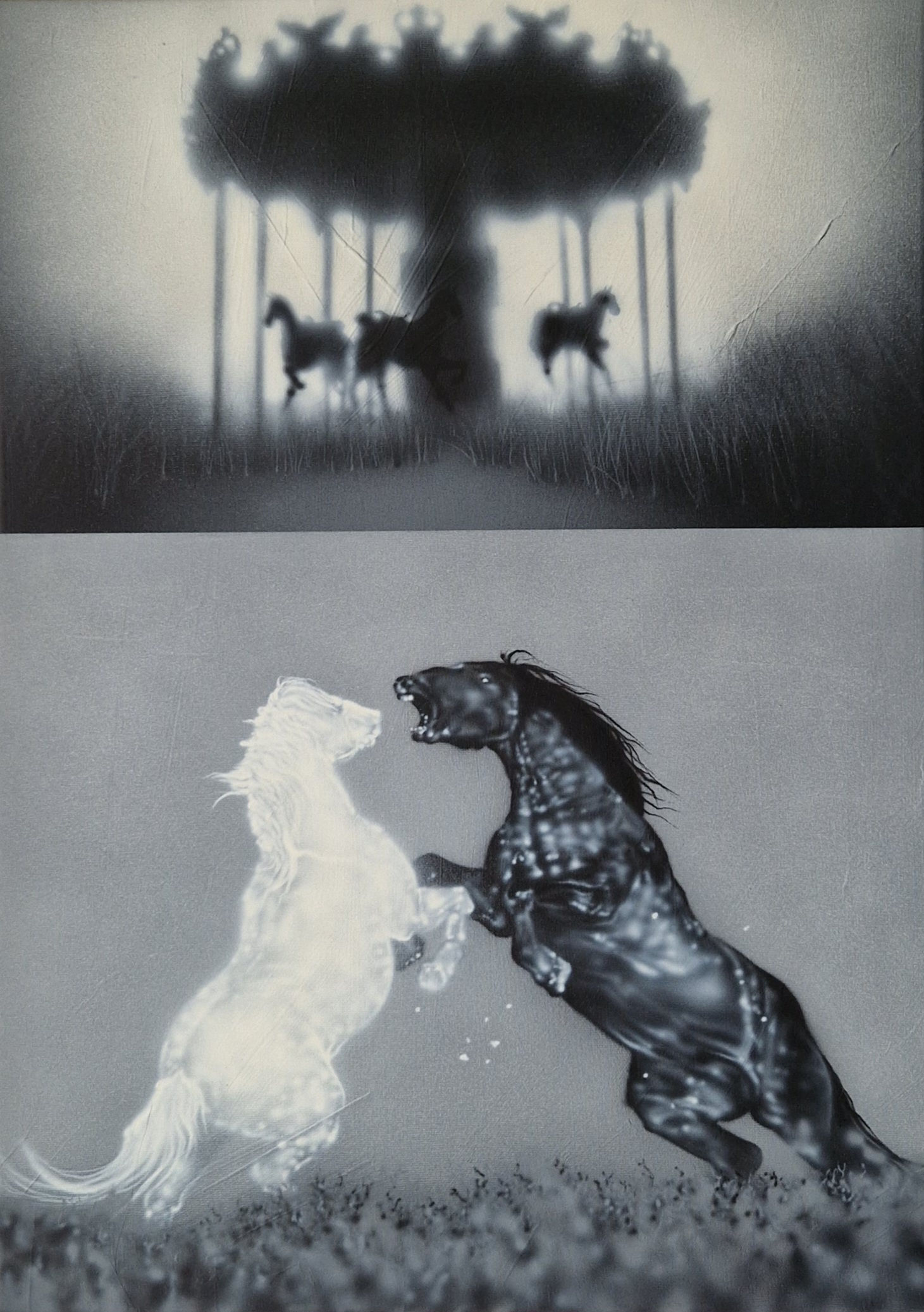 It is thanks to the special effects makeup training that I have been introduced to the airbrush, my main medium today. I actually still use the same today, as it was and still is quite a quality tool. However, I did not fall in love with it directly. It took me still a few years before I started to really try to use and master it as a fine art medium.