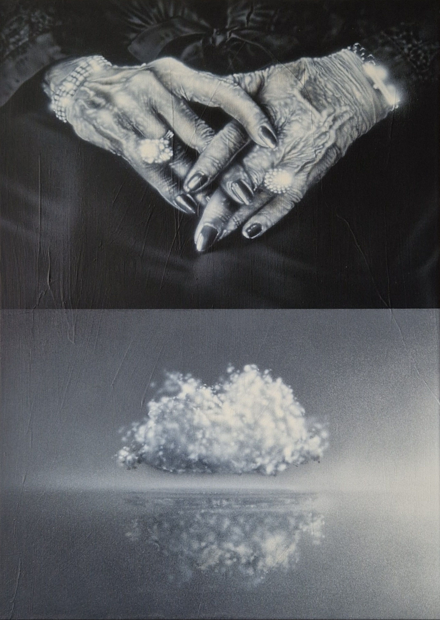 It is for sure different from what I was doing before. I was getting frustrated with my paintings, and I felt like I was not able to actually show what I wanted, it was just not enough. It took me a really long time before I was even just able to start trying something new. I started by superimposing images and objects on top of each other, and eventually I tried to completely split my canvas in two, and that's when I knew it was right.